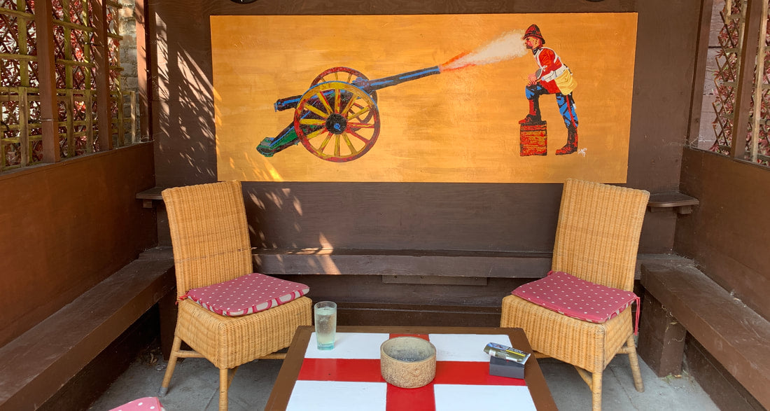 The Cannon in Brompton, Medway (UK) is a Royal Engineers pub and they wanted a suitable mural for their smoking area; here we have a sapper lighting his cigarette from a cannon.