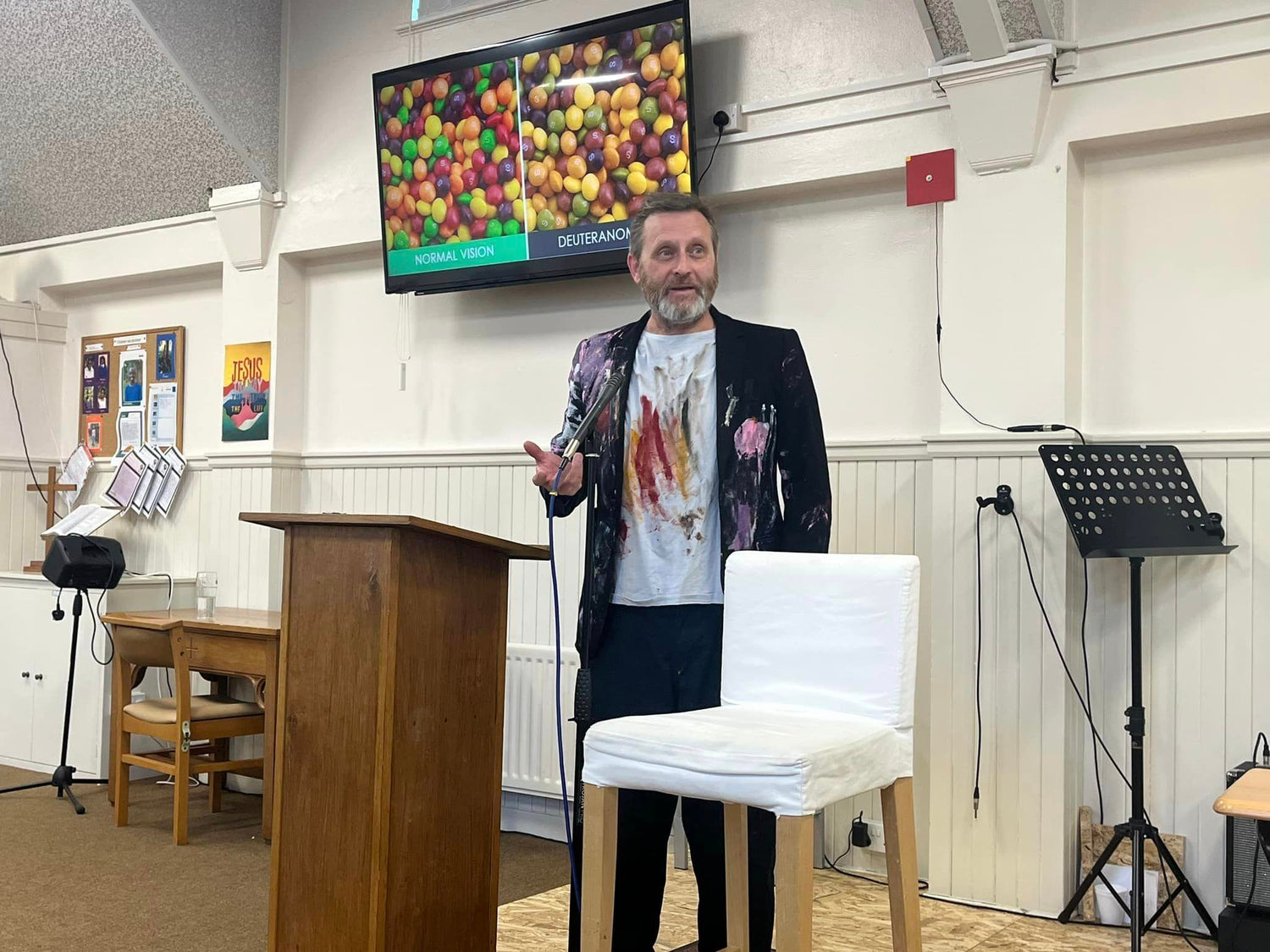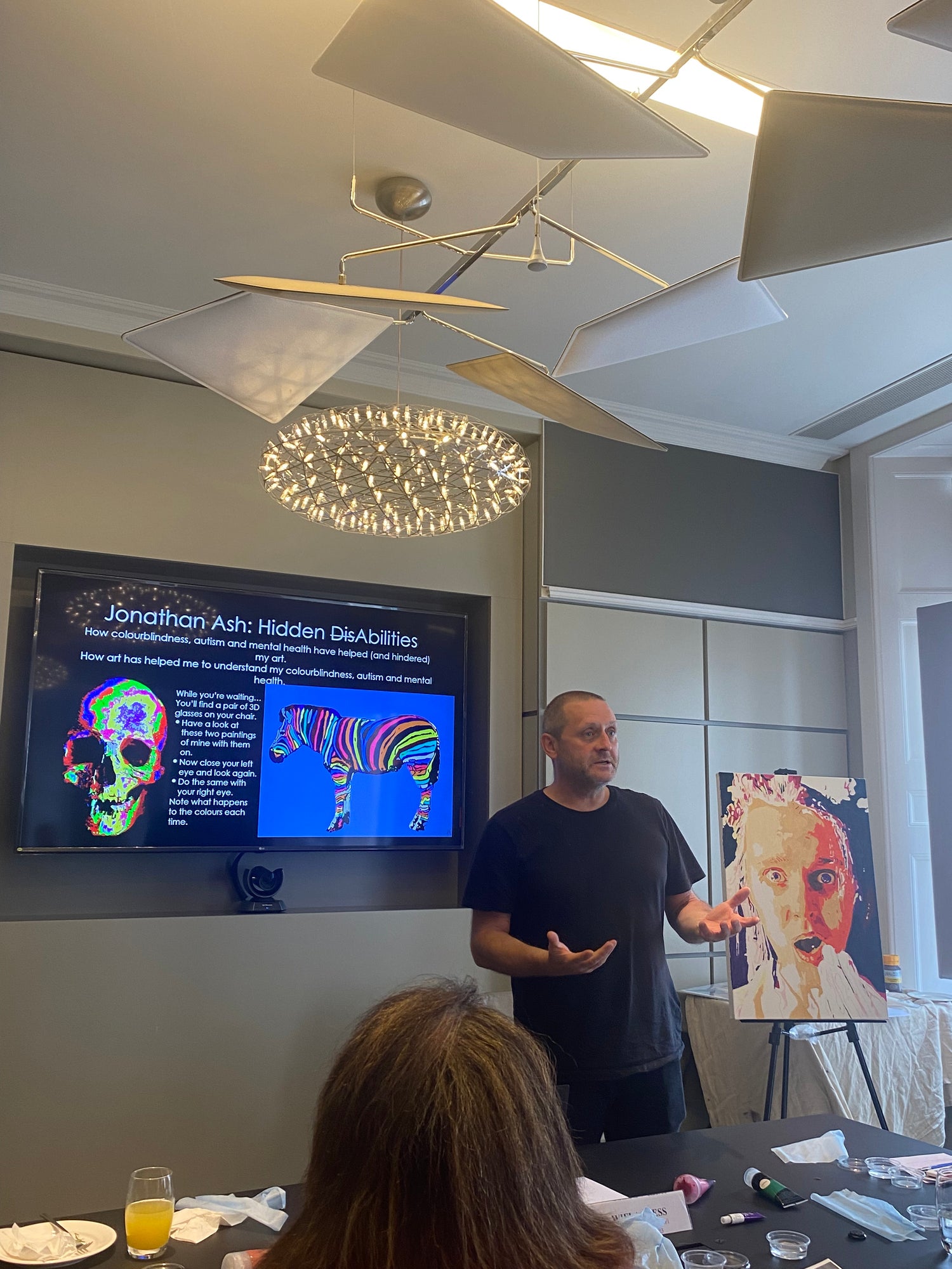 Jonathan Ash is an experienced speaker and has been booked many times for his "Hidden Disabilities" one hour talk about his colourblindness and autism and how they have helped and hindered his journey as an artist and small business owner. He has also run a number of two hour workshops which incorporate the talk as well as participants having a go at some of the techniques Jonathan Ash uses when he paints. It gets wonderfully messy.